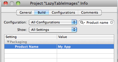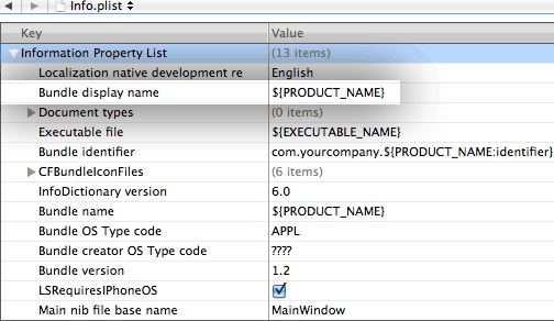 我在苹果的样本项目之上构建了我的苹果的样本项目代码。它将应用程序命名为"LazyTable“,当它放在iPhone的主屏幕上时。我想改这个名字。如果我转到info.plist并手动在Bundle display name键中输入一个新名称,它就能工作。但是我不想硬编码,因为PRODUCT_NAME在很多地方都使用。
