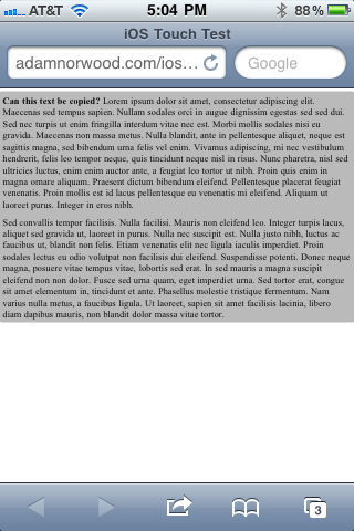 另外,我在我的iPhone上尝试了你的例子,你说得对,它不是复制的,只是当我把手指按在上面的时候突出显示出来: