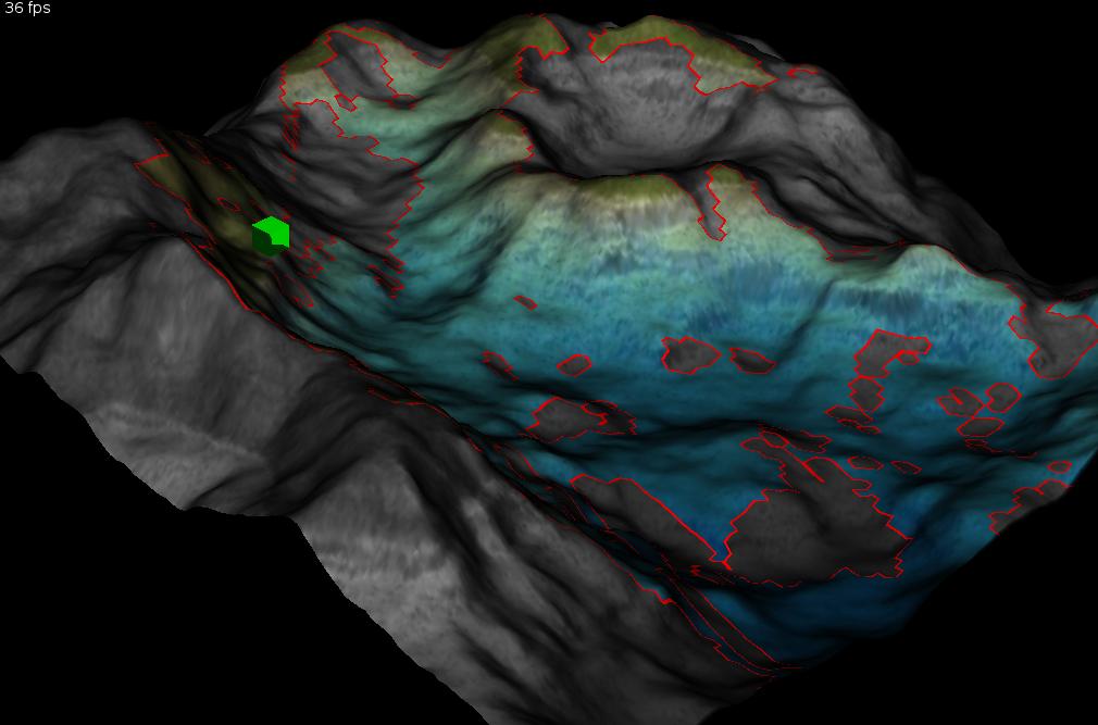 这里有一个高度图,上面有一个特定的vantagepoint (绿色立方体)的能见度(如“分水岭”中的“视图”?)画在上面: