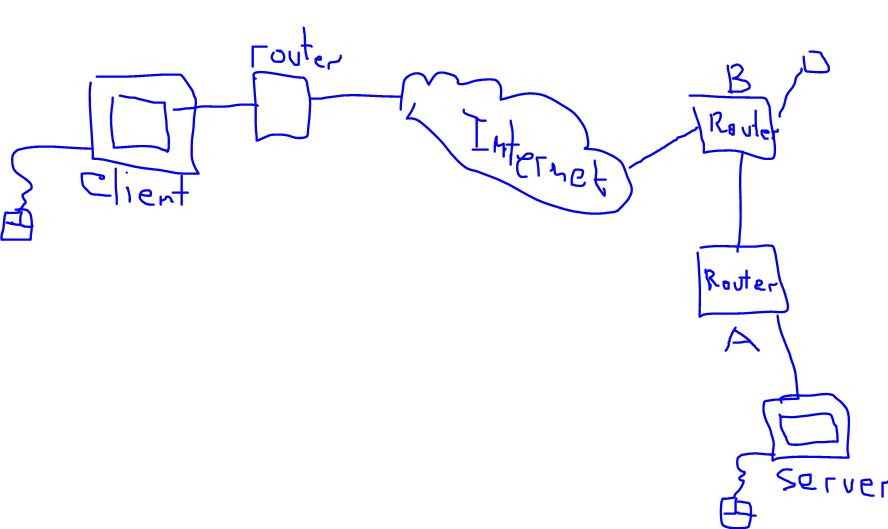 我的问题来了。服务器正好在办公室里。该服务器连接到路由器A,路由器A连接到路由器B,路由器B连接到internet。在另一个例子中,这个示例类似于服务器上的最后一个示例,其中有一个额外的路由器。客户就在别的地方。我们不关心网络设置是如何在客户端计算机上,只要它有互联网访问。