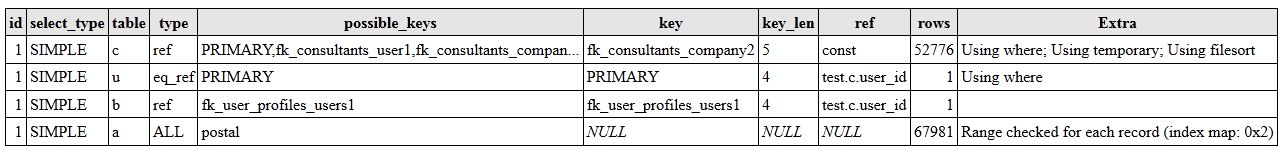 你应该(至少)索引: cities.postal,users.typ,users.activated,users.banned,user_consultants.incorporated