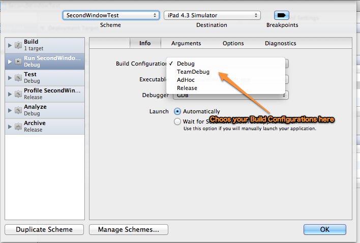 然后创建一个新的方案并编辑您的“运行”设置,选择您以前创建的构建配置。