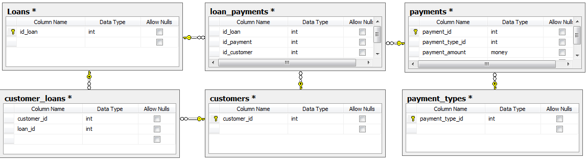 你需要像附件这样的东西。请注意,customer_loans表是一种额外的和过度的,但是如果有任何与客户和贷款相关的列,而不是客户的贷款支付,那就是它的去处。