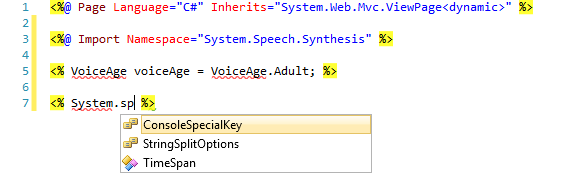 这很奇怪。MVC视图拒绝识别System.Speech命名空间。怎么回事?还有这方面的工作吗?我有一个ViewModel,它具有来自这个名称空间的VoiceAge和VoiceGender枚举属性,但是MVC视图没有发挥作用。