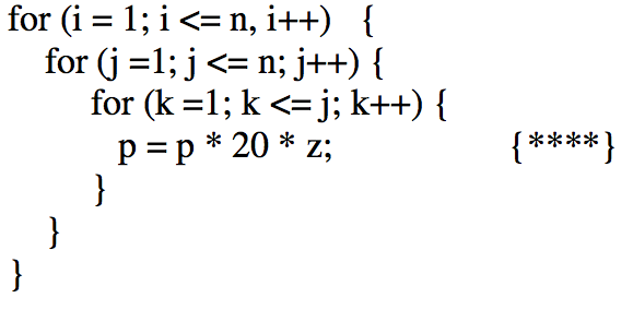 p=p*20*z被执行了(j) + (j-1)+(j-2)+(j-3)...1时间。这恰好等于j(j+1)/2.2 * (j(j+1)/2)。最后,"i“循环恰好发生了n次,因此,总的来说,它是n(2 * (n(n+1)/2)).这是我的思维过程。我说的对吗?谢谢。