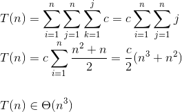 i <= nj <= nk <= j基本上,第三个循环也会运行n迭代,因为j <= n所以k <= n,这意味着复杂性将是n * n * n = O(n ^ 3)。