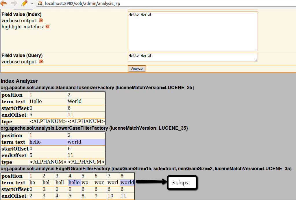 确切的短语搜索不起作用,因为默认情况下,查询slop参数=0。搜索一个短语“Hello”,它搜索具有顺序位置的术语。我希望EdgeNGramFilter有一个参数来控制输出定位,这看起来像一个旧的问题。