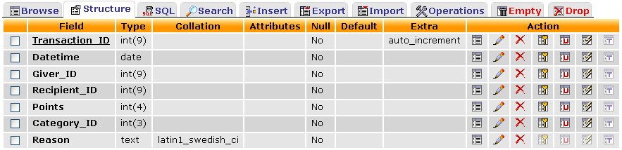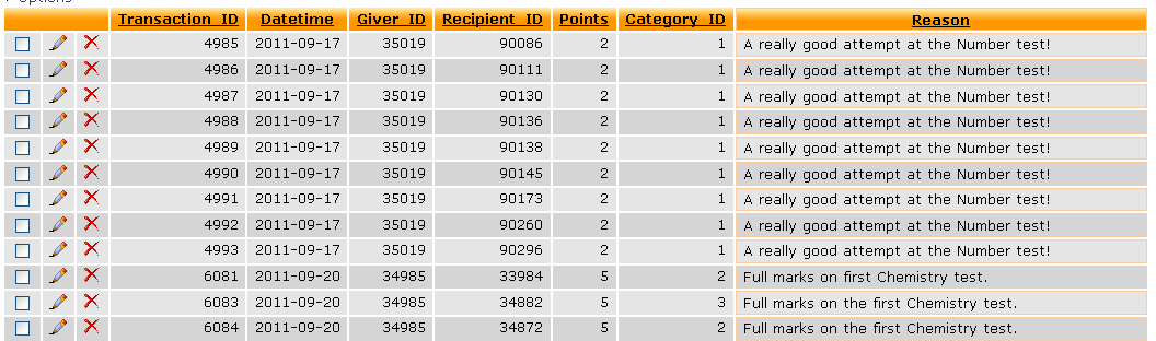 就我目前的做法而言,每个“交易”都有一个"Giver_ID“(工作人员奖励积分的成员)、一个"Recipient_ID”(学生获得分数)、一个类别和一个理由。这样,每次工作人员发布30分时,我都会将30行放到数据库中。