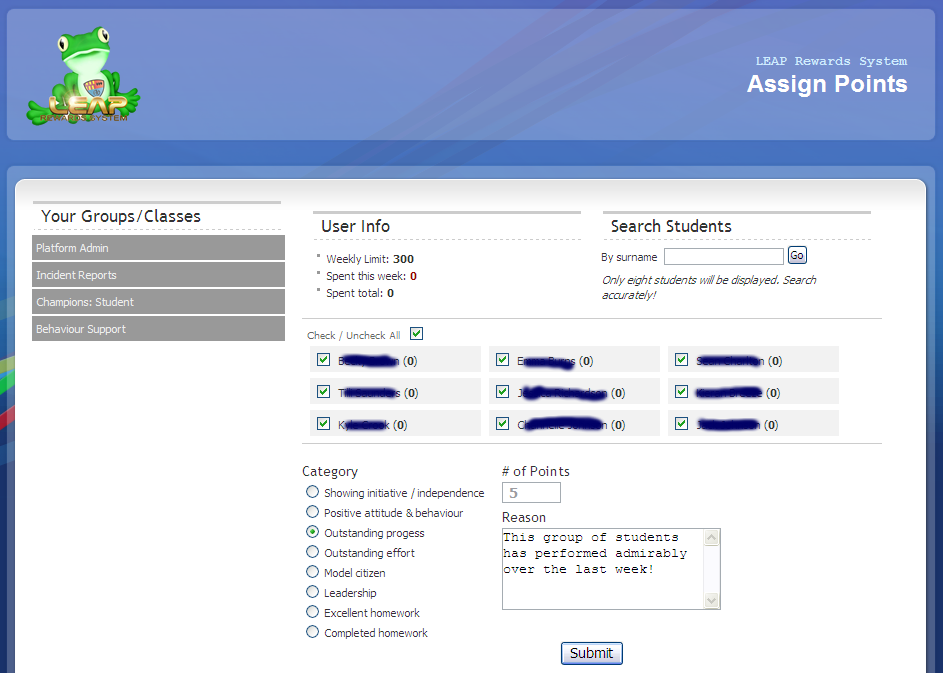 前提是工作人员奖励学生行为良好等等。这可能意味着30名学生的班级一次得到分数。工作人员每周有300个积分的限制,目前大约有85名工作人员正在使用该系统(这可能会增加)。