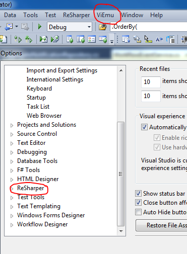 我用红色圈出的顶级viEmu菜单没有键盘映射弹出框等,即在Tools \ Options中,然后是viEmu菜单项。