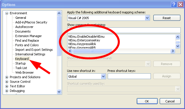 关于ViEmu的键绑定设置,您可以通过按Menu|ViEmu -> Set Keybindings来启用所有的Menu|ViEmu -> Set Keybindings默认绑定。在Tools-> Options -> Environment->Keyboard中调整或重置它们就像@eric说的那样。