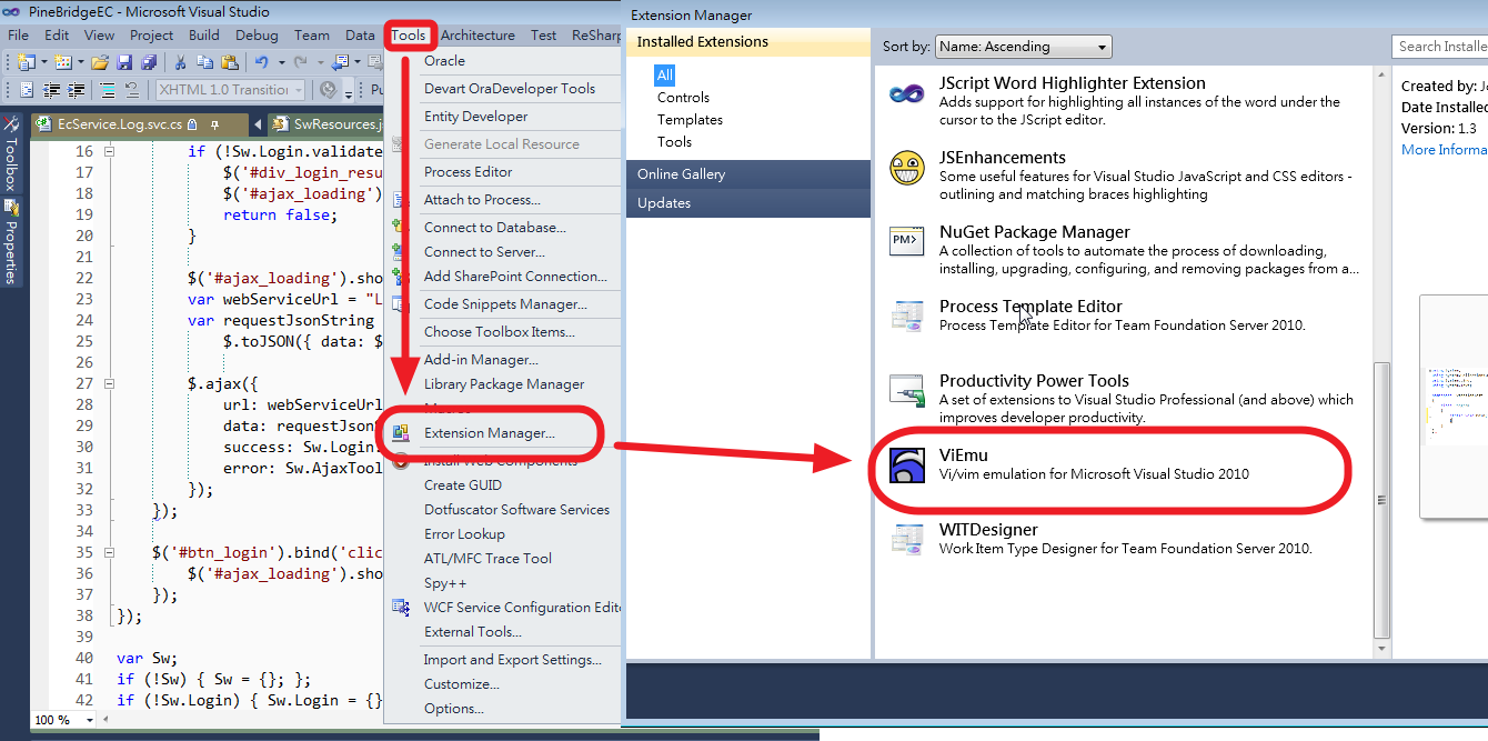 首先,ViEmu作为扩展安装在VS2010中,因此您应该能够在Menu|Tools -> Extension Manager -> Installed Extensions -> ViEmu中卸载它。