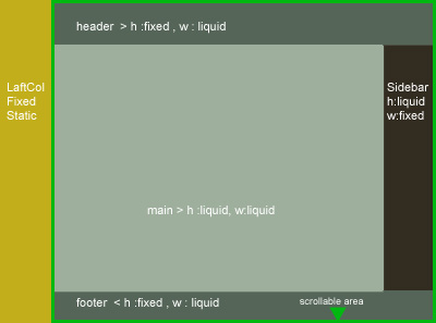 绿色框架是可滚动的,它包含页眉、页脚和边栏。