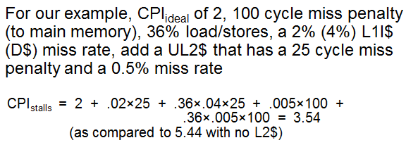 根据我从问题中所理解的:2= CPI理想。0.02 = L1脱扣率。25 =罚则小姐。(但这难道不是L2缓存的遗漏惩罚吗?).36是内存指令的数字(为什么不在.36 x .02 x 25之前)。.04 =?4%的牙套?这是什么意思?.005 = L2失分率。