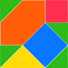 然后回答有关面积比例的问题。例如,蓝色钻石与整个正方形的比率是多少?那么,橙色和粉红方块的比例是多少?(答案: 4/18,6/2,通过观察每个形状是如何由绿色三角形构建的)。