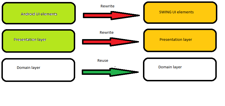 Android使用Java。这意味着,任何封装在域层中的java代码都可以作为java桌面应用程序的一部分重用,而不依赖于android。如果应用程序设计良好,GUI与域和其他层分离,这将归结为只将android元素(最终与表示层一起)转换为java桌面组件(SWING.)。