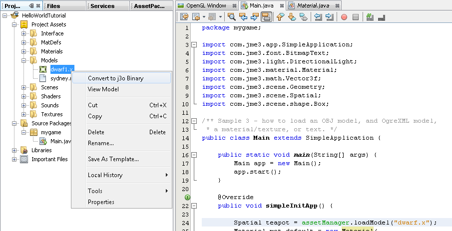 但我不知道该怎么用。我尝试向我的资产文件夹中添加一个模型,然后在SDK中右键单击它,然后选择“转换为j3o二进制文件”,但是这没有什么效果:没有弹出对话框,而且似乎没有任何变化。我的代码仍然生成一个运行时警告,说明它不知道如何加载.x文件。