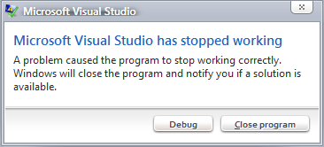 另外,当我用一个解决方案(使用Win7 7的跳转列表或使用CMD参数)启动VS时,我会得到一条“资源管理器崩溃并将重新启动”的消息,该消息立即消失。之后,视景演播室正常启动。我的系统:
