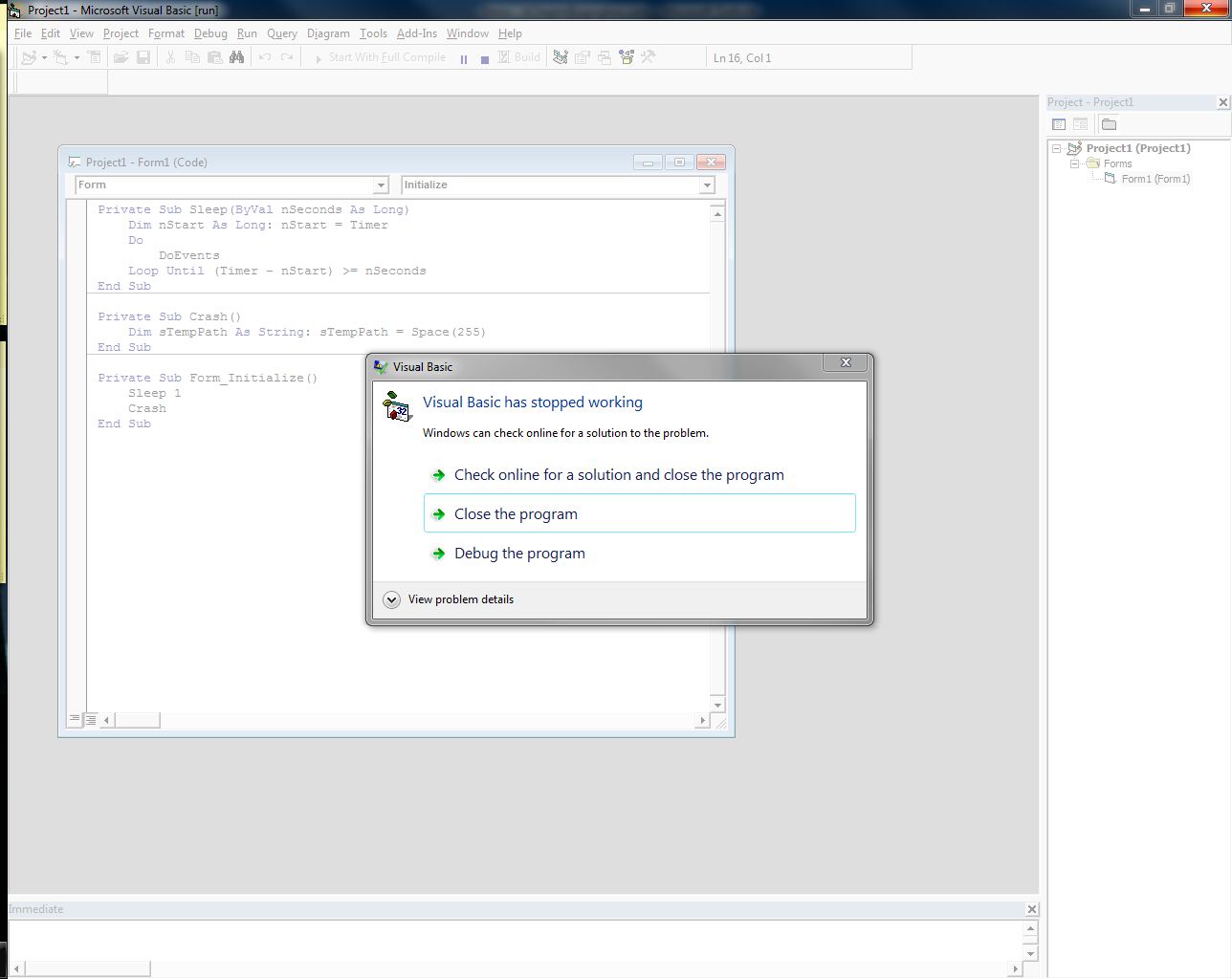 创建一个新的VB6项目。将下面的代码粘贴为项目代码。命中跑。看看它会不会坠毁..。删除或简化代码中您喜欢的任何内容,然后它就会正常工作。,谁能解释一下为什么这会崩溃吗?