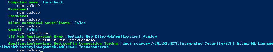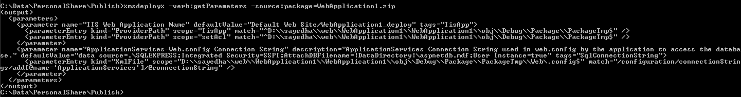 给出了一些信息,如果您想使用我的扩展进行类似的w/o操作, MSDeploy有一个动词getParameters,它可以用来确定包中存在的所有参数。例如,我们可以执行命令