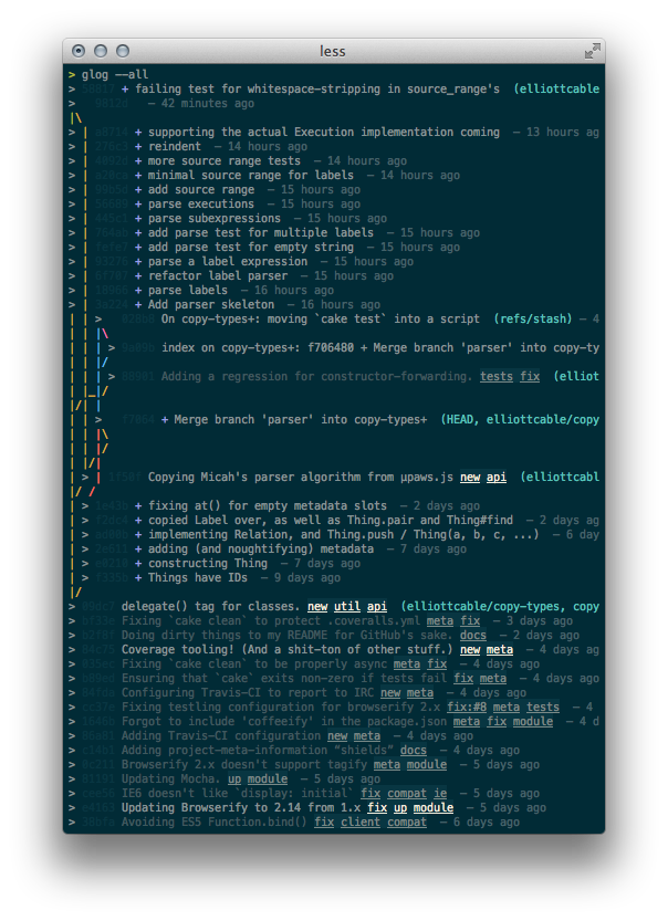 对于那些访问Google结果的人来说,你可能想看看醋酸纤维细胞的解决方案(和深度博客文章!),如果你在寻找标准的git-log风格的输出,多行,并提供关于每一次提交的详细信息的话,这是非常好的。