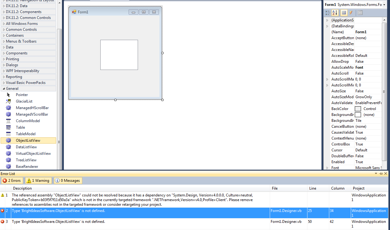 我刚下载了ObjectListView。当objectListView放在我的vb.net表单上时,添加dll文件后,会显示一个错误。
