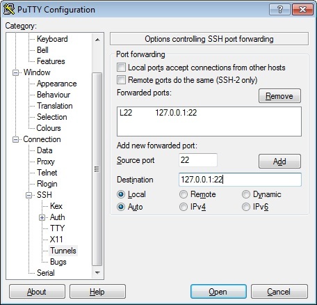 现在您可以做的是指定一个本地“隧道”( SSH端口转发规则),如: L22 127.0.01:22 (见附件)。如果使用ssh命令行,请添加以下选项:-L 22:127.0.01:22。