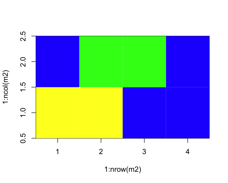 image(1:nrow(m2), 1:ncol(m2), m2, col=c("yellow", "blue","green"))