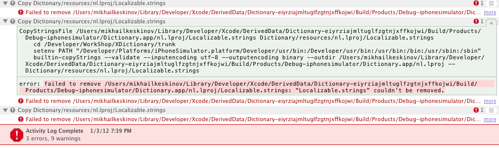 error: failed to remove /Users/mikhailkeskinov/Library/Developer/Xcode/DerivedData/Dictionary-eiyrziajmltuglfzgtnjxffkojwi/Build/Products/Debug-iphonesimulator/Dictionary.app/nl.lproj/Localizable.strings: “Localizable.strings” couldn’t be removed.