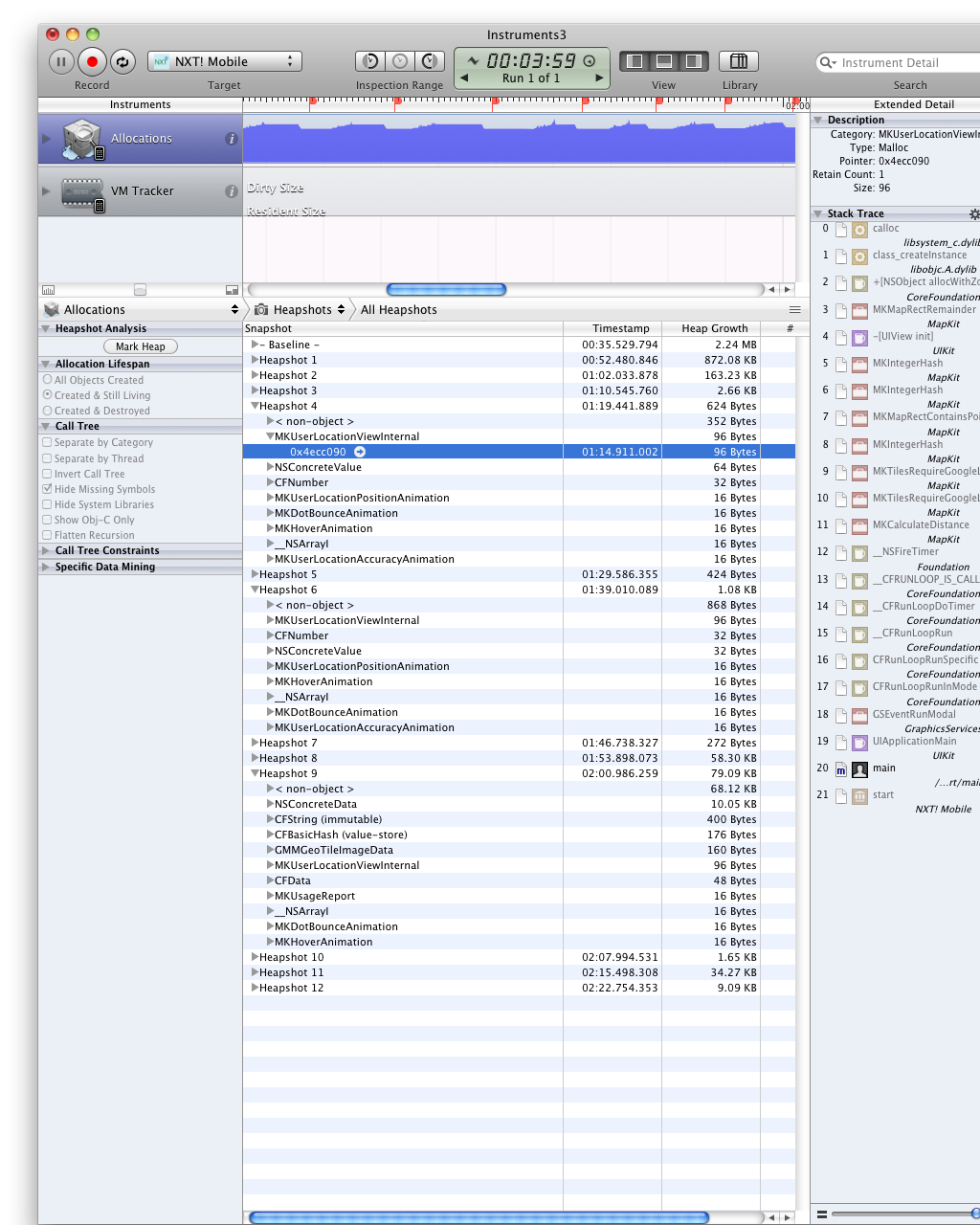 我有一个导航控制器,其中VC1将VC2推到导航堆栈上。VC2在基于选项卡的视图中有一个MKMapView,用户位置被打开。当我使用检查是否使用工具进行重复分配时,我反复发现一些MKUserLocation对象在返回VC1时没有被释放。