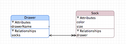 抽屉和袜子都是核心数据模型/存储中的NSManagedObjects。在Drawer上,socks关系是一个命令-多个关系到Sock。这个想法是袜子在抽屉里是按特定顺序排列的。在Sock上,drawer关系是socks关系的逆关系。