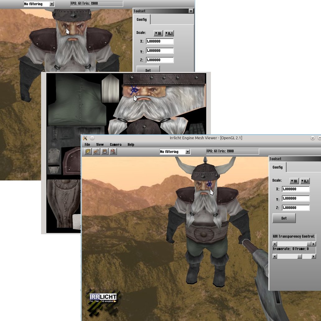 }我只想让我的目标实时可画。我目前的问题是:错误的纹理坐标计算和非唯一顶点UV坐标(所以,在矮人斧头的一边画一些东西会在斧头的另一边画同样的东西)。
