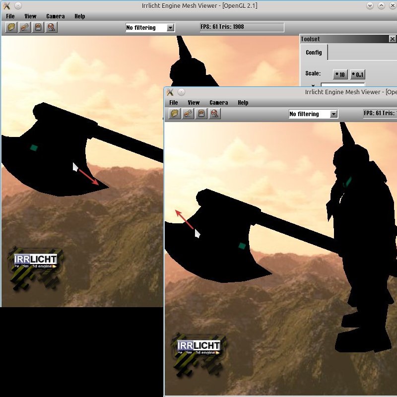 是第一个也是更重要的问题:“**错误的纹理坐标计算”:以but为中心的坐标的计算是正确的,但正如我所设想的那样,输入的数据是错误的。我假设您使用irrlicht的CollisionManager和TriangleSelector获得三角形和TriangleSelector。问题是,三角形顶点的位置(您从collisionTest得到的返回值)在WorldCoordiates中。但是您需要在ModelCoordinates中使用它们进行计算,下面是您需要做的工作:
