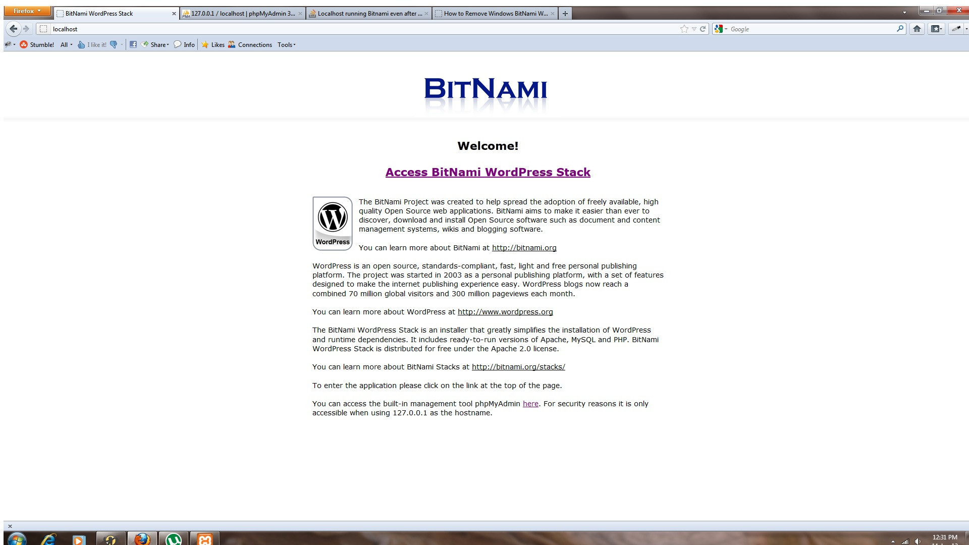 我使用Bitnami安装并运行wordpress。当我遇到一些问题时,我决定将软件改为XAMPP。这里,是问题产生的地方,。当我在浏览器上输入localhost时,它会显示Bitnami欢迎页面。XAMPP的本地主机不应该来吗?我怎样才能解决这个问题。下面是我输入localhost时浏览器的屏幕截图。