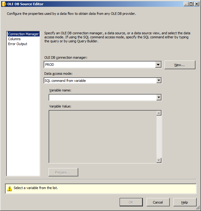 上述代码以SQL查询的形式提供访问模式,查询嵌入到OLE源中。希望它使用“”,而这个变量是@[User::sourceQuery],而我所坚持的是在源代码中使用一个变量。