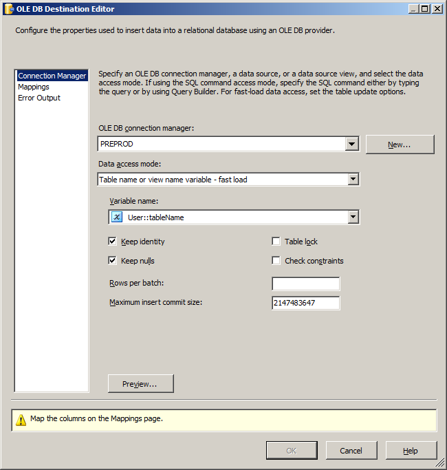 this.Source.AccessMode = AccessMode.AM_OPENROWSET_FASTLOAD_VARIABLE;这些都是正确的访问模式,因为它们适用于目的地(我仍然尝试过它们,但它们没有像预期的那样工作)。