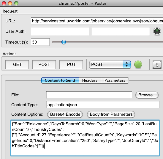 2012-02-14 11:55:48 [4048:207] T restkit.network:RKRequest.m:318 Prepared POST URLRequest '<NSMutableURLRequest http://servicestest.foo.com/jobservice/jobservice.svc/json/jobquery>'. HTTP Headers: {