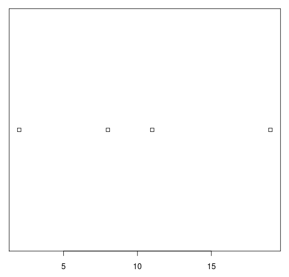 x <- c(2, 8, 11, 19) y <- c(12, 7, 8, 0) stripchart(x)