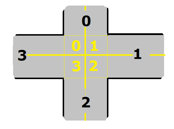 如果一辆车从方向进入2并想左转。它应该通过quandrant 2,quandrant 1,最后是quandrant 0。