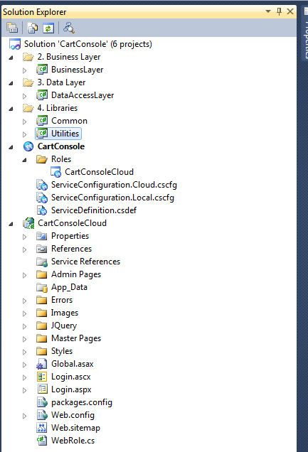 基本上,我所做的是创建一个Web角色并将表示层放入其中,然后创建两个单独的类库(分别是业务层和数据层)项目,并使用引用将它们链接到表示层。