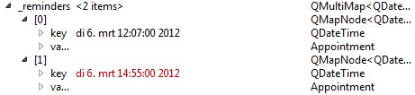 QMap<QDateTime, Appointment>::iterator it = _reminders.find(now);其中now的值为di 6. mrt 12:07:00 2012。这是我的循环条件: