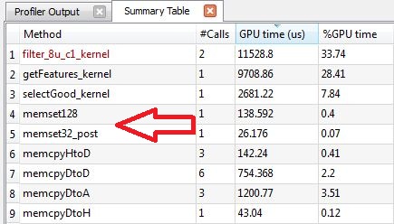 分析器的结果显示了cudaMemset函数的两个不同的结果。