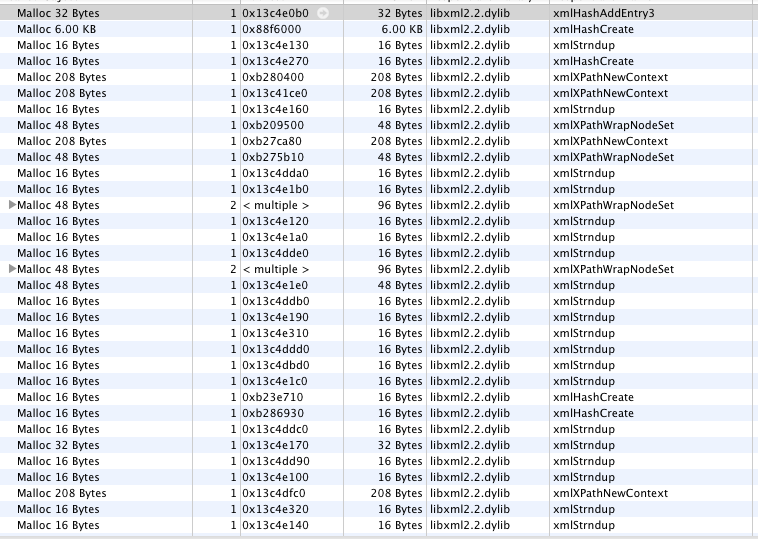 在我的项目中实现使用XpathQuery时,我很难删除/避免泄漏。目前,我正在使用libXml2.2.dylib进行解析。当我使用仪器检查内存泄漏时,我在框架中发现了大量的泄漏。