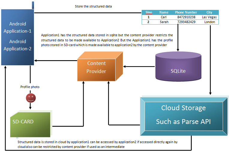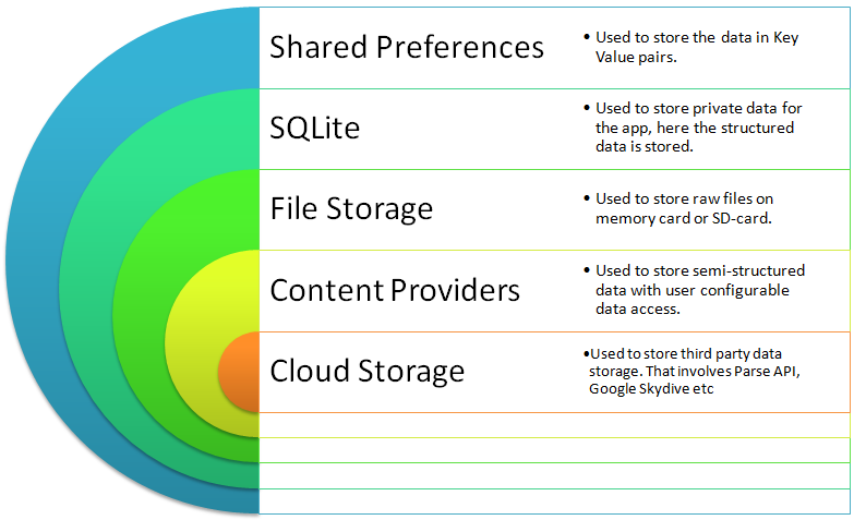 SQLite 是在常规数据库中存储几乎所有您想要的东西的地方--它的优点是将事物组织成表、行和列。它最适合在UI中以列表形式显示的内容--最好的例子是伟大的发明,即CursorAdapter。这里存储的数据在设备重新启动时也会持久化,并随app卸载而删除。如果将sqlite连接到ContentProvider上,还可以在应用程序之间共享数据。数据是使用游标访问的,在这里您可以调用方法,就好像在执行sql语句一样。