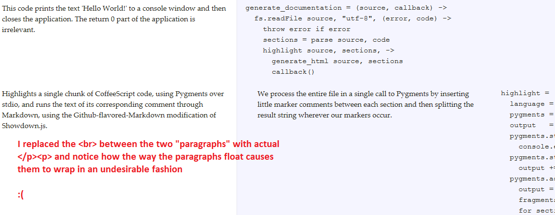 我遇到的问题是,当我有多个段落元素时,由于它们以固定宽度浮动的方式,它们倾向于重叠彼此的行。这迫使我添加了自己的断线,这是很愚蠢的,我真的很想摆脱它: