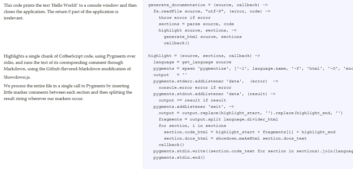 <p>Highlights a single chunk of CoffeeScript code, using Pygments over stdio, and runs the text of its corresponding comment through Markdown, using the Github-flavored-Markdown modification of Showdown.js.<br/>