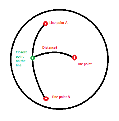 请注意,这是一个理想的例子。“点”可以在球体表面的任何地方,也可以是段开始-结束.很明显,我不是在寻找穿过球体的距离。数学不是我更强的一面,所以我不理解正常化或笛卡尔。也许我也应该注意到,路径AB是最短的,距离也是最短的。