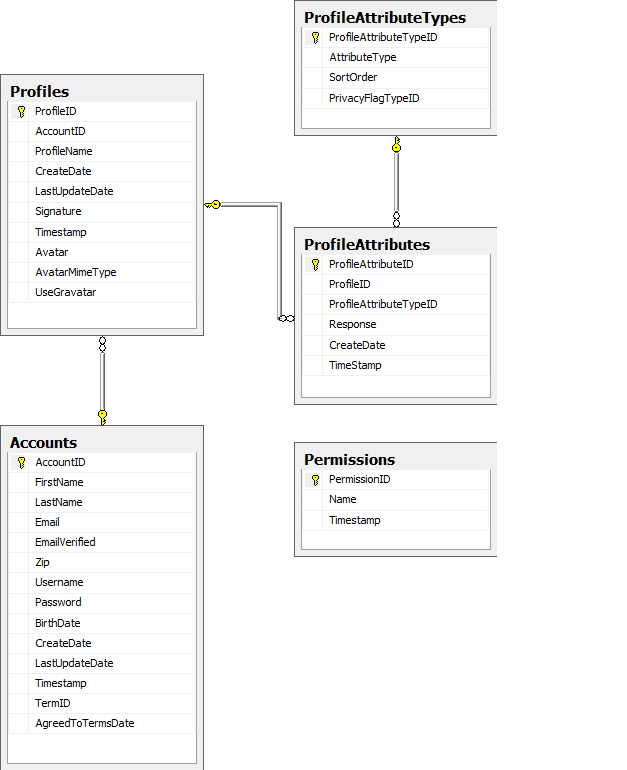 我已经发展了一些设计,以更一般地处理配置文件所附的ERD图像。教师和学生的“标题”存储在一个名为ProfileAttributeTypes的表中,并将响应(来自excel文档或通过web表单上的输入字段)放入ProfileAttributes表中。这样,学生和教师配置文件都可以与配置文件字段的动态流相关联。“权限”表告诉我们是在处理学生还是教师。