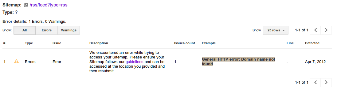我试图提交一个网站的网站地图到谷歌网站工具,但我得到了一个非常奇怪的错误与域名。首先,我将站点地图作为RSS文档提交,我认为它是有效的(检查这里)。