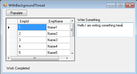 }代码是相当straightforward.In的"GetEmployeeRecords()“方法,我们正在准备data.We已经引入了"Thread.Sleep(1000)”来延迟。在“填充”按钮单击事件中,我们将填充Gird。